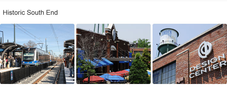 What is now Southend was at that time an emerging industrial district with factories and mills lining South Boulevard and the surrounding blocks. For decades this area produced fabrics, textiles, and other goods sold around the country and around the world. As manufacturing began to leave the area many of the factories were boarded up or coverted into warehouse space. In the mid 90's developers and urban pioneers began take note of these great structures and the change began. New uses for these buildings brought business back to the area -- showroom and retail, offices, restaurants, and condominiums are now found in these buildings. The Design Center and surrounding buildings house more than 200 design, graphics, film and production businesses can be found in the area helping create the creative vibe.